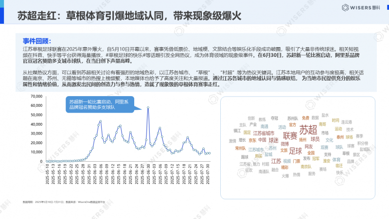 江苏草根足球联赛在2025年意外爆火,自5月10日开幕以来,赛事凭借低票价、地域梗、文旅结合等娱乐化手段成功破圈,吸引了大量非传统球迷。相关短视频在抖音、快手等平台获得海量播放,#草根足球的快乐#等话题引发全网热议,成为体育领域的现象级事件。在6月30日,苏超新一轮比赛启动,阿里系品牌官宣冠名赞助多支城市球队,在当日创下声量高峰。