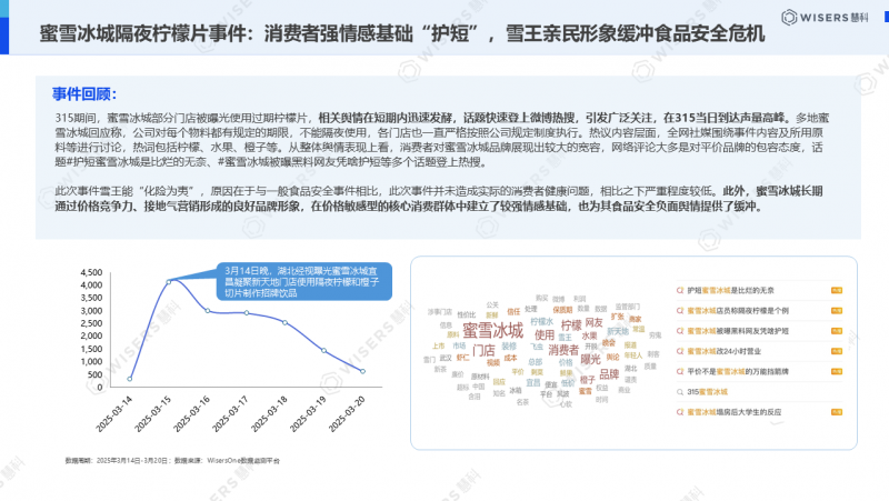 315期间,蜜雪冰城部分门店被曝光使用过期柠檬片,慧科讯业WisersOne数据显示,相关舆情在短期内迅速发酵,话题快速登上微博热搜,引发广泛关注,在315当日到达声量高峰。多地蜜雪冰城回应称,公司对每个物料都有规定的期限,不能隔夜使用,各门店也一直严格按照公司规定制度执行。热议内容层面,全网社媒围绕事件内容及所用原料等进行讨论,热词包括柠檬、水果、橙子等。从整体舆情表现上看,消费者对蜜雪冰城品牌展现出较大的宽容,网络评论大多是对平价品牌的包容态度,话题#护短蜜雪冰城是比烂的无奈、#蜜雪冰城被曝黑料网友凭啥护短等多个话题登上热搜。