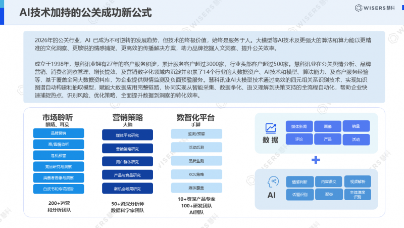 慧科讯业Wisers深耕社交舆情营销及大数据应用领域,基于2025年全行业实践的深度复盘、数据洞察及年度热点/危机事件的全景式解读,并结合对2026年行业发展趋势的前瞻性预判,重磅发布《2026中国公关行业白皮书》。
