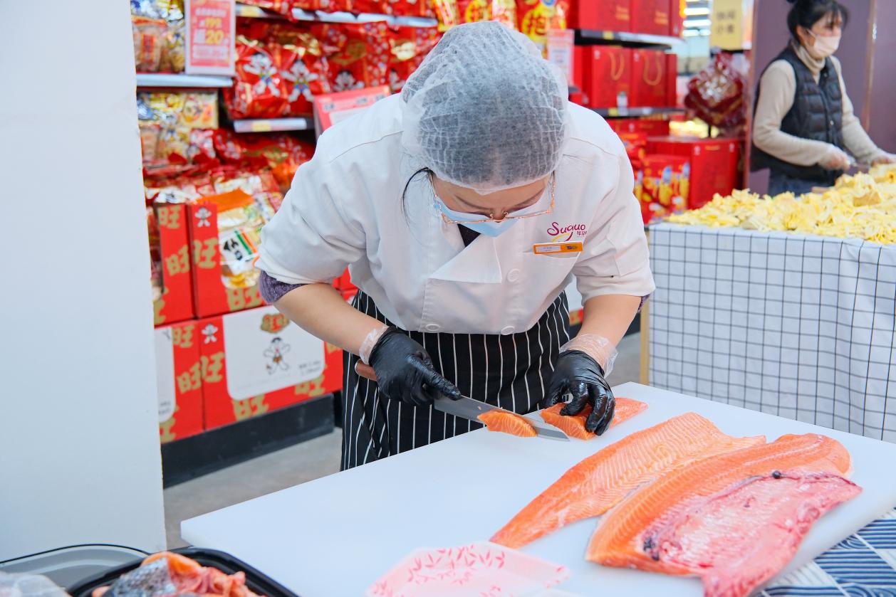 生鲜板块的品质升级直观可感,焕新门店扩大生鲜区面积,创新引入“明档厨房”模式,现场制作多款特色鲜制美食,强化“鲜制现售”的体验感;同时推出三文鱼开鱼秀、牛羊肉现切等常态化项目,让生鲜消费从“单纯选购” 升级为“沉浸式体验”,让品质看得见、摸得着。