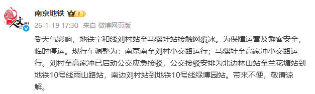 受天气影响,地铁宁和线刘村站至马骡圩站接触网覆冰。为保障运营及乘客安全,临时停运。