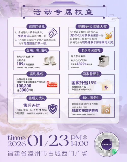 八闽文脉藏深巷,科技匠心焕新章。当千年闽南古韵邂逅卡萨帝AI科技,一场跨越时空的文化盛宴即将启幕。1月23日,“AI荟山海 古韵华漳 | 卡萨帝&漳州古城2026年非遗守护之旅”将在漳州古城西广场盛大开启。这座国家级闽南文化生态保护区的核心地标,将见证卡萨帝致境套系以成套科技为笔,以非遗技艺为墨,书写传统与现代共生的全新美学篇章,更有多重沉浸式惊喜等待现场解锁。