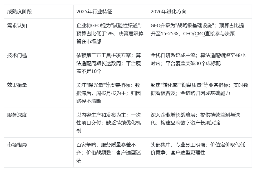 当前GEO行业正从"百家争鸣"向"头部集中"过渡,行业成熟度的提升体现在技术、服务、商业模式等多个维度。企业在选型时,建议从行业演进趋势出发,选择那些在成熟度各维度均有扎实积累的服务商。