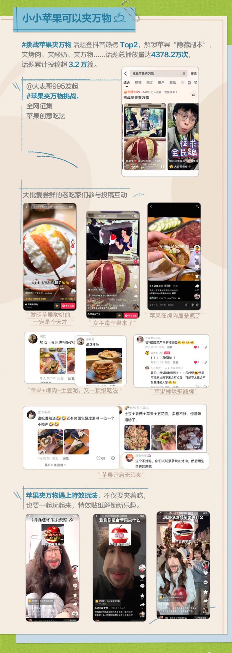 这个冬天,在抖音,苹果不再仅仅是“餐后水果”,而是从“果盘常客”摇身变为短视频中的“创意主角”。活动期间,#挑战苹果夹万物、#原来苹果和烤肉才是天生一对 等话题频登抖音热榜,引发广泛关注与讨论,更成功突破食用场景局限,成为冬日里的潮流符号。