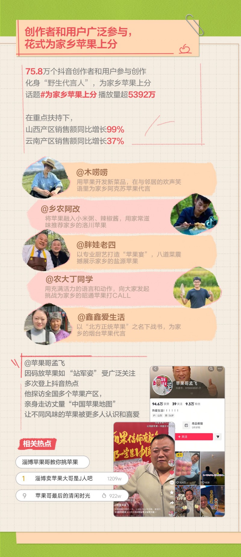 活动的热度,也让许多普通人被看见。@苹果哥孟飞 因码放苹果如“站军姿”而走红,活动期间多次登上抖音热点。广受关注的同时,他亲身探访云南昭通、山西运城、陕西、山东等多个苹果产区,用带着方言味道的普通话和并不华丽的镜头,真实呈现每颗苹果的品质、口感以及产区生产链,让不同风味的苹果被认识。