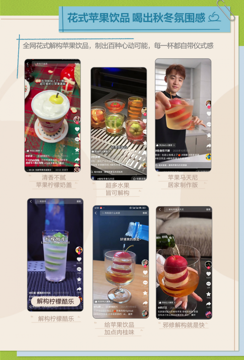 与此同时,平台用户变身“苹果饮品主理人”,在抖音掀起一波“解构苹果”的打卡热潮。从温暖热饮到精致特调,每一杯都载满了秋冬氛围感,成为年轻人社交分享的符号,进一步拓宽苹果食用和消费场景。