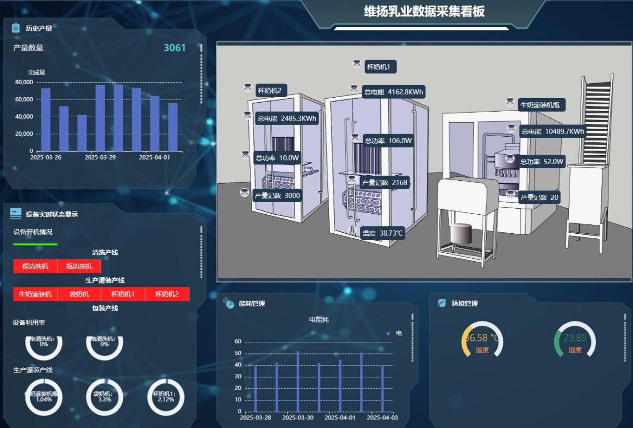 “车间部署300余台(套)物联网传感器,实时采集设备振动、温度、能耗等数据,通过边缘计算实现故障预测。”维扬乳业相关负责人介绍,“在前处理设备区域,通过产线自带控制终端系统进行管控,包括温度、存储量、发酵时间等,通过中控室将数据同步采集,可实时查看产线状态。”