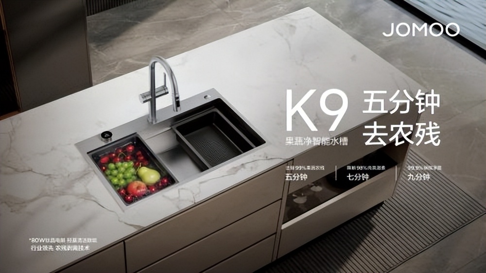 K9水槽采用钛晶电解农残剥离技术,三类净化模式适应多元需求5分钟深层去除99%果蔬农残,7分钟大幅降解肉类激素,9分钟实现99.99%碗碟净菌。