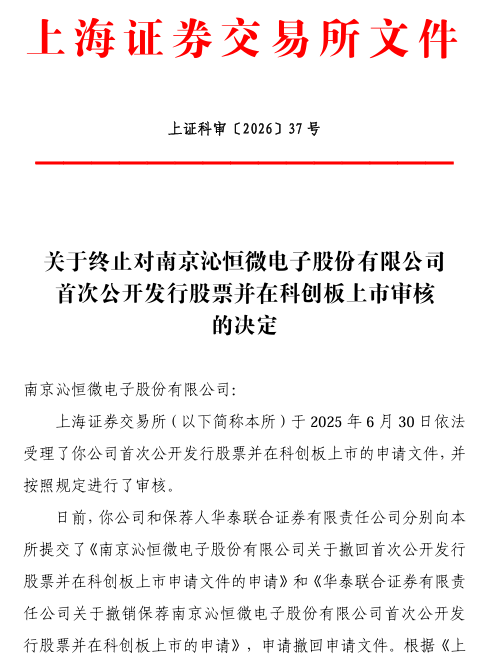 新华日报财经讯 1月20日,上交所宣布终止对南京沁恒微电子股份有限公司首次公开发行股票并在科创板上市的审核。此次终止的直接原因是公司及保荐机构华泰联合证券有限责任公司主动撤回了发行上市申请文件。至此,沁恒微成为2026年开年以来第二家科创板IPO折戟的企业。
