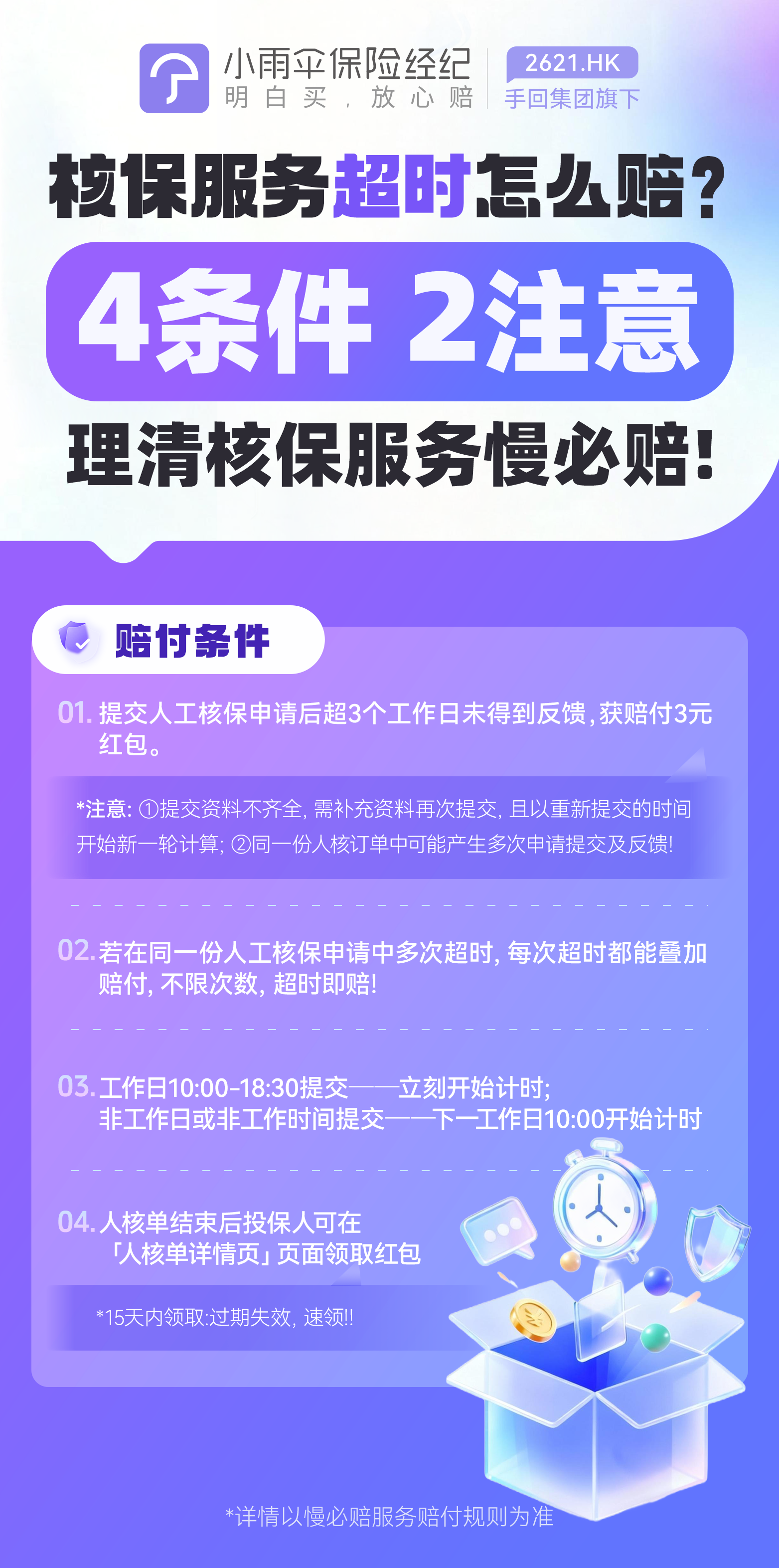 1. 服务说明:提交人工核保申请后超3个工作日未得到反馈,获赔付3元红包。 *人核申请提交后如资料不齐全,会被反馈补充资料,需再次补齐资料并提交,从再次提交时间开始新一轮计时,同一份人核订单中可能产生多次申请提交及反馈。