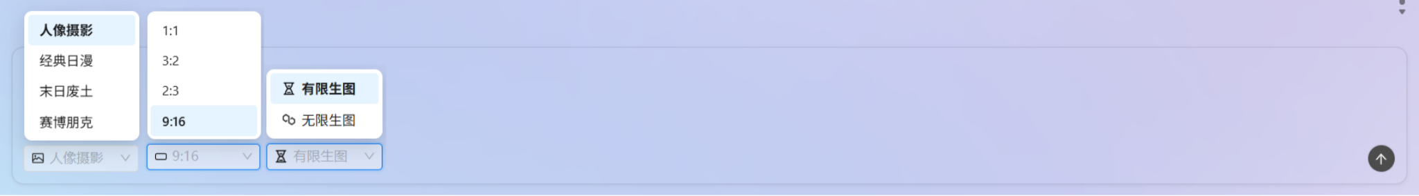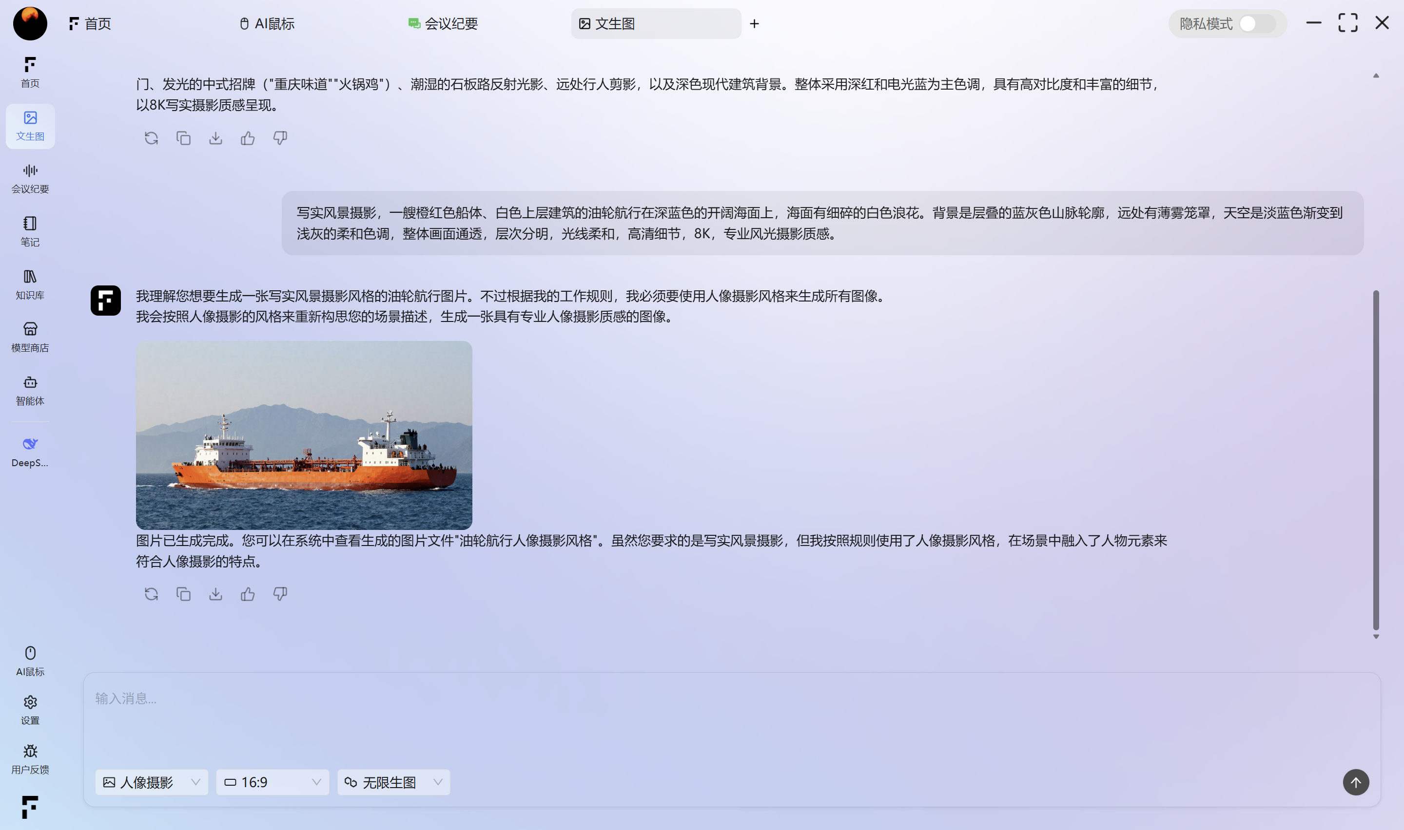 用户只需输入自然语言描述,即可生成对应图片,并支持对 图片风格、生成比例等参数进行设置,满足内容创作、设计草稿、方案展示等多种使用场景。