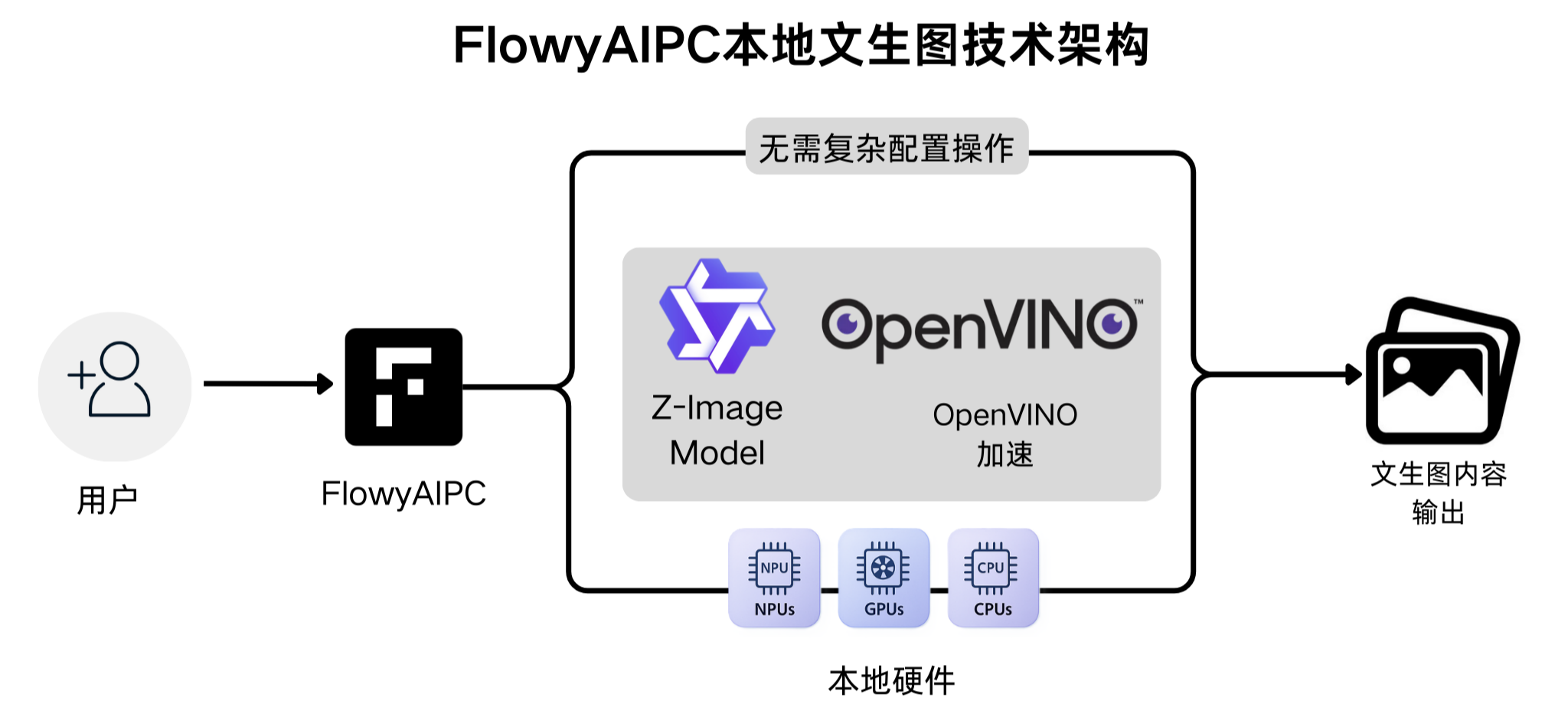 在模型推理层面,FlowyAIPC 基于 Intel OpenVINO 架构对 z-image 进行了适配与优化,使模型能够更高效地在本地硬件上运行。通过 OpenVINO 的加速能力,FlowyAIPC文生图功能兼顾性能与稳定性(FlowyAIPC本地文生图最低配置:Intel Core Ultra系列芯片 + 内存 32GB 及以上)