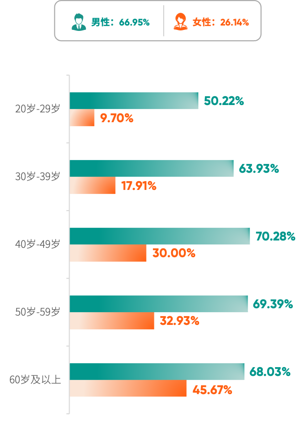 男性企业家中,66.95%的体重指数(BMI)增高检出率是女性的2.56倍,且在各个年龄段的检出率均超过五成,并高于女性。