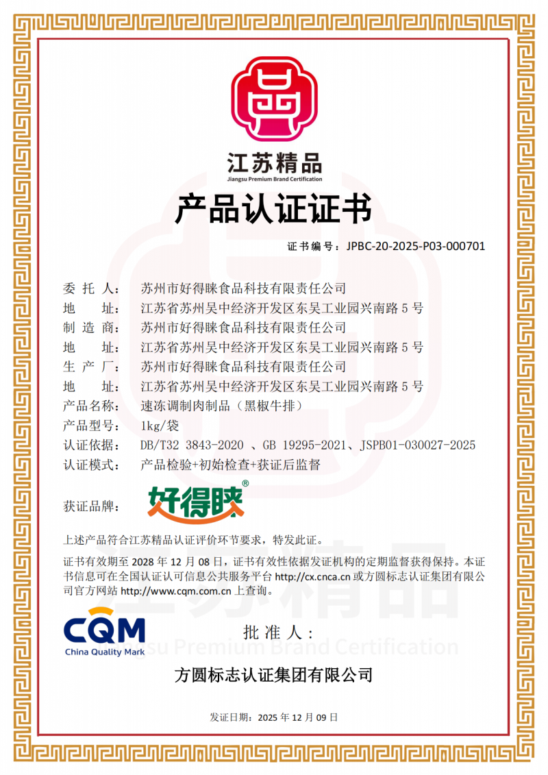 2025年12月,好得睐旗下“黑椒牛排”产品通过严格评审,荣获“黑椒牛排江苏精品”产品认证。该认证基于原料、工艺、品质及特色等多维度综合评定,表明该产品在品质与特色方面获得了权威认可,进一步体现企业对产品精益求精的追求。