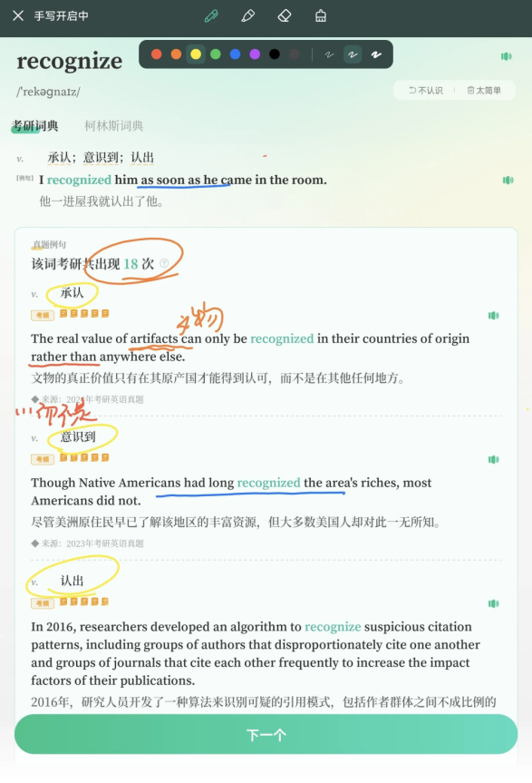 1. 在真题语境中,像出题人一样理解词义。背单词时绝不能再满足于只看中文释义,建议去精读我们为每个核心单词配备的【真题例句】。而扇贝单词最智能的地方,在于直接为你划好了重点:单词的【核心考义】会被标注,同时还会标注出该词的【考频】。这些数据明确地告诉你,这个词在考研中更倾向于考察哪个意思,让你在记忆时能立刻分清主次。