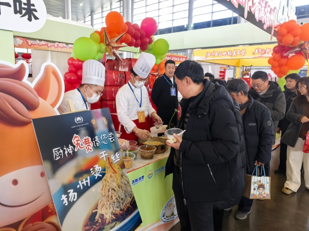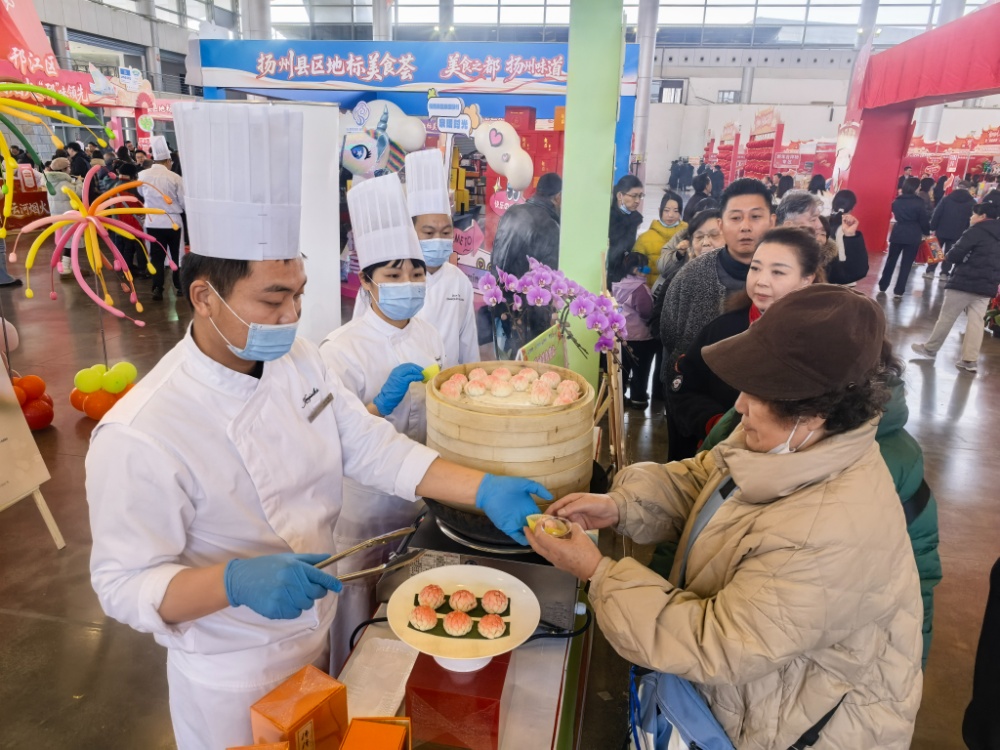 当天上午,扬州国展中心已是一片红火。作为系列活动的“开场锣鼓”,“悦购扬州·年货优品”促消费市集在这里热闹开市。上午8时多,市民们已络绎不绝涌入。200多个特色摊位依次排开,160多家商户集中亮相,从宝应的黑菜咸肉、高邮的汪豆腐,到仪征的牛肉炒饭、生态科技新城的鳜鱼馄饨……空气里飘散着食物诱人的香气,耳边是熟悉的乡音吆喝,目光所及是琳琅满目的年货。这里不是简单的集市,而是一个缩微的、热气腾腾的扬州。