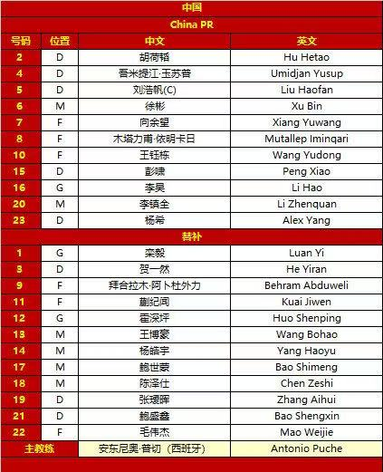 中国队首发阵容如下:16-李昊、2-胡荷韬、4-吾米提江、5-刘浩帆、15-彭啸、23-杨希、6-徐彬、20-李镇全、7-向余望、8-木塔力甫、10-王钰栋。