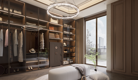 内饰的“奢侈感”更是触动高端用户的关键。手缝Nappa皮内饰层触感细腻,为珠宝、名表等贵重物品打造了“软包座舱”,避免划痕磨损的同时,更在开启瞬间营造出奢华仪式感。180°外铰链设计支持大角度开门,内部“福禄寿喜财”的分区收纳既科学有序,又暗含吉祥寓意;底部隐秘暗舱则为隐私物品提供“隐形空间”,这种“功能性与仪式感并存”的设计,完美契合豪宅业主对“精致收纳”的追求。