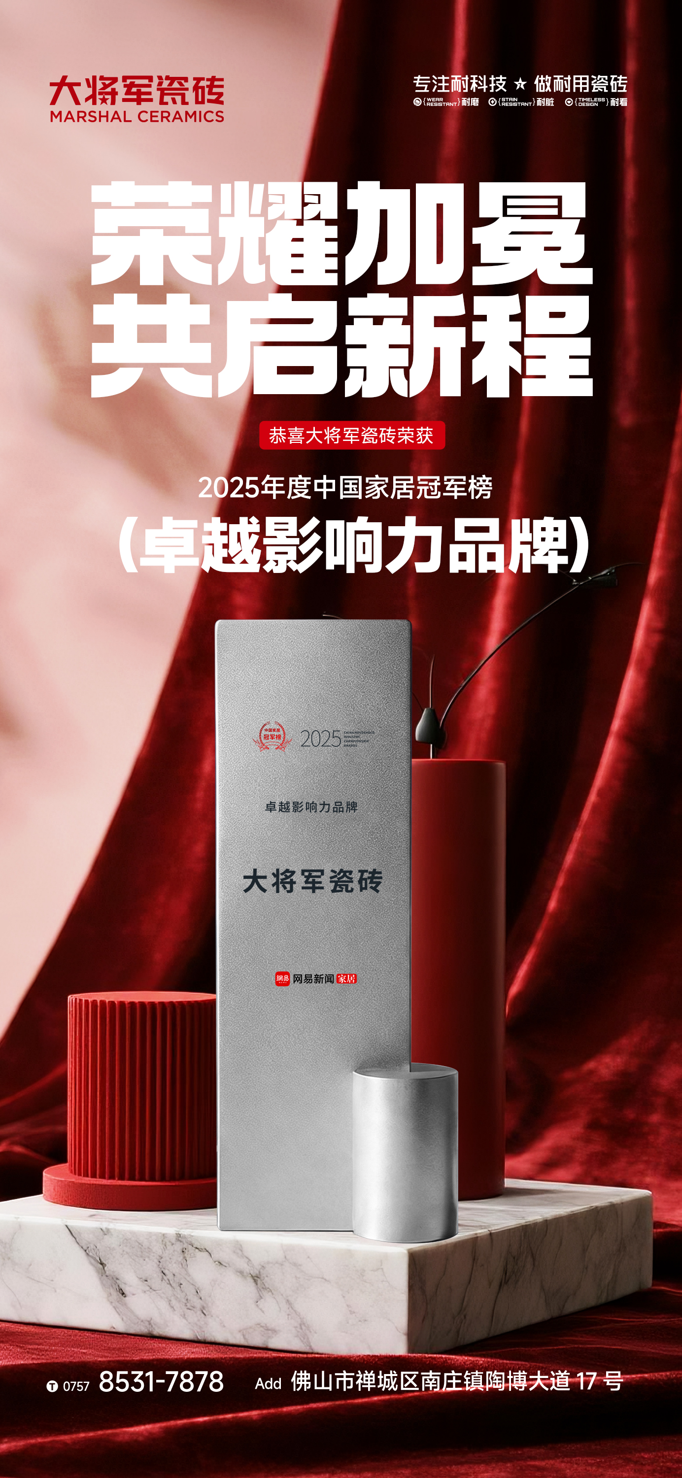 面向未来,再启新程。荣获“卓越影响力品牌”,对大将军瓷砖而言,是荣誉,更是责任。站在新起点,品牌将继续秉持长期主义精神,加大在绿色智造、低碳技术、智能家居融合等领域的研发投入,深化品牌文化建设,强化渠道协同效能,致力于成为“营造高品质美好人居”的倡导者与践行者。