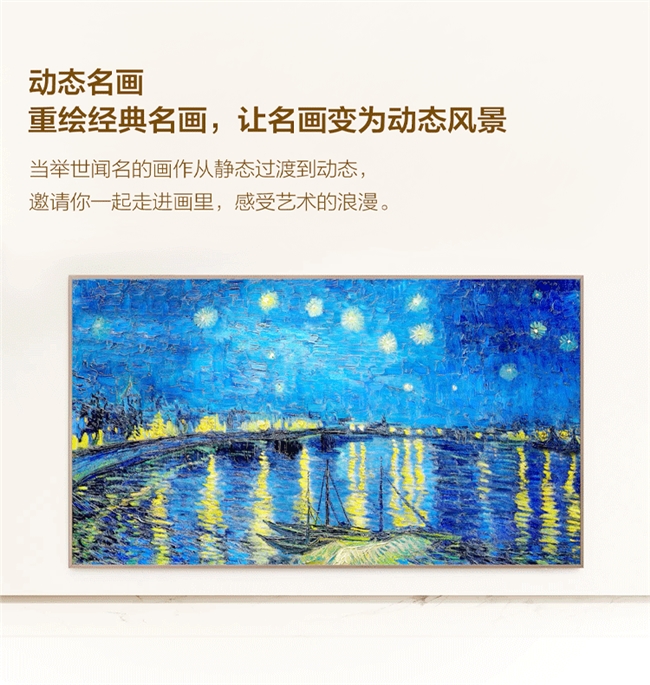 如果说A400 Pro的硬件设计是 “解决了电视与家居的适配问题”,那它的软件艺术生态就是“让电视成为家居氛围的加分项”,彻底摆脱了“电视关屏像黑补丁”的尴尬。A400 Pro内置了上百幅世界经典名作,涵盖印象派大师作品、现代艺术、抽象几何装饰艺术等多种风格,不使用时切换到艺术画廊模式,这些名作就能轮流充当壁纸,为家里增添满满的艺术光彩。