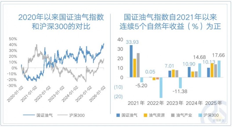 数据来源:Wind,时间区间为2020年1月2日-2026年1月6日,国证油气指数(指数代码:399439,指数基日:2002-12-31)自2021至2025年近五个完整会计年度的收益率分别为33.93%、0.05%、7.01%、10.90%、10.13%。指数历史收益情况不代表未来表现,也不构成相关基金业绩表现的保证。