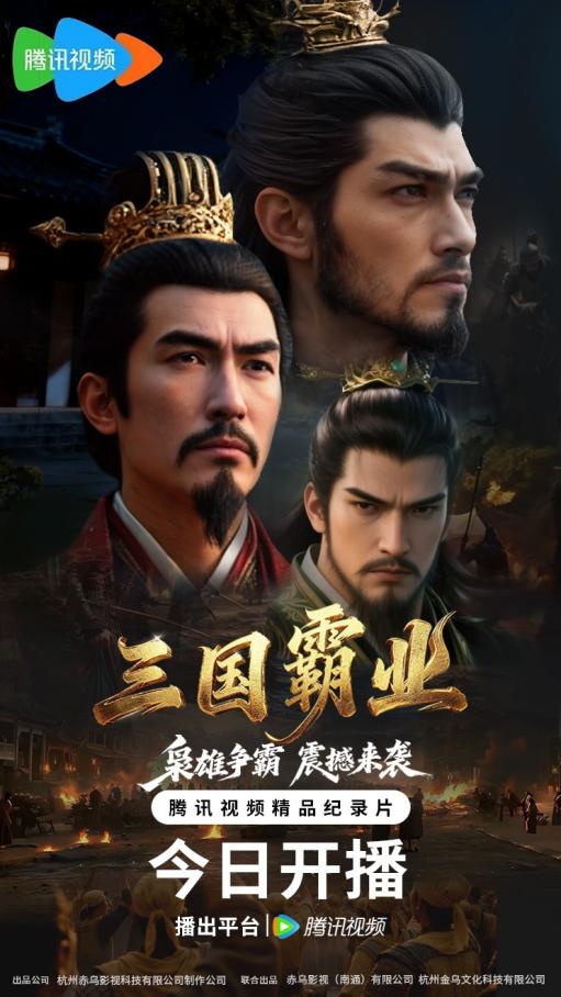 1月23日,由杭州赤乌影视科技有限公司制作出品,赤乌影视(南通)有限公司联合出品的AI历史纪录片《三国霸业》,正式于腾讯视频平台上线。本片采用了真人出镜+AI技术的展现形式,借助AI技术复原三国的人物及战争场景,以现代化的视听语言创新历史叙事,为观众提供沉浸式的历史体验。