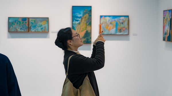 展览的另一大亮点,是田学森之子田继允的30余幅作品。自四岁起,田继允便跟随父亲旅居华山、昆仑山等地参与写生,山河草木成为他艺术道路上最亲密的启蒙老师。此次展出的作品按年龄轨迹依次陈列,清晰呈现其艺术成长历程。这些作品摒弃了刻板的技法束缚,以纯粹的色彩搭配与灵动的线条运用,捕捉山河最本真的面貌。他笔下的华山,未作复杂的光影修饰,而是以大块简洁的色块凸显出磅礴魄力;山间云雾则通过轻快的笔触呈现,尽显自然的灵动之美。