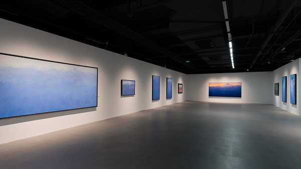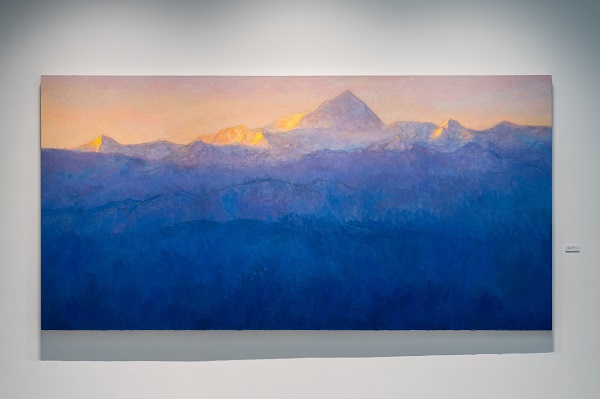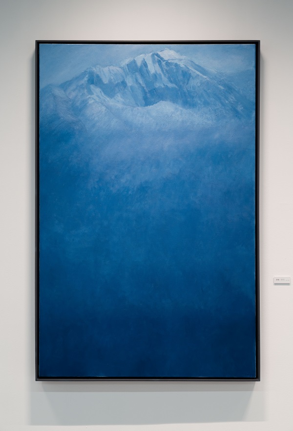 本次展览的一大亮点,是田学森的“蓝调”系列作品。该系列如其名,以自然赋予的平和蓝色为基调,将昆仑、喜马拉雅等圣山的巍峨气象融入朦胧光影之中,未对具象细节做过多繁琐雕琢,而是通过层叠写意的笔触构建山的整体意象。近距离观赏作品,能清晰感知到介于有无、隐显之间的丰富肌理与深层韵味;部分作品中,金色光线穿透蓝色画面映照山巅,鲜明的色彩对比让圣山更显庄重神圣,恰如其分地诠释了道家“惚兮恍兮,其中有象”的哲学意境。这些作品不仅是直观的视觉呈现,更蕴含着艺术家对生命本真、自然大道的思考与探寻,展现出东方哲学精神与当代油画语言的深度融合。