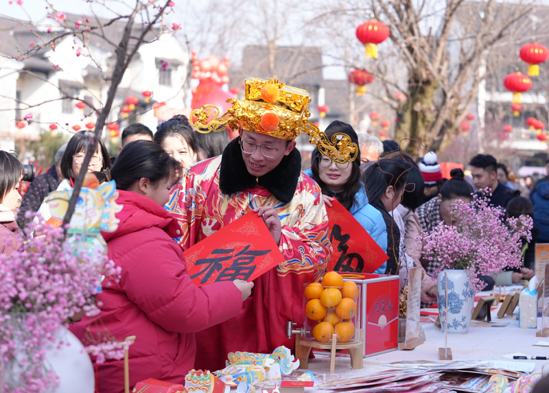 活动现场,五大特色体验环节错落排布,国风氛围感拉满,成为全民共享的文化乐园。竹韵·信物环节中,参与者在手作老师指导下,将打磨光滑的安吉竹节与马年配饰编织成串,把“节节高升”的新年期许绕于腕间;诗趣·偶遇环节里,身着喜庆服饰的财神NPC手持飞花令宝箱巡游送福,参与者主动拦截“财神”抽签答题,在欢声笑语中品读诗文、赢取文创;颜彩·新妆、拓福·印记、掌灯·寻光等环节,分别以《诗经》植物彩绘、马年雕版拓印、福马花灯手作为载体,暗合《诗经》中植物意象与祈福文化,让大家在创作中触摸千年文脉,将新春福运与诗意美好一并珍藏。
