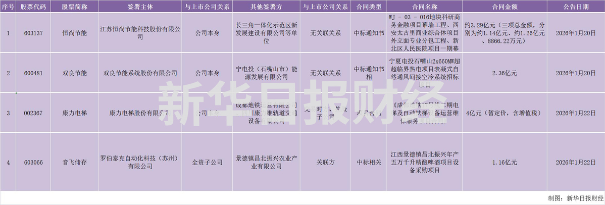 1月20日,江苏恒尚节能科技股份有限公司发布公告,公司于近日收到三份中标通知书。中标项目包括:WJ-03-016地块科研商务金融项目幕墙工程(联合体中标金额约1.14亿元)、西安太古里商业综合体项目外立面专业分包工程(中标金额约1.26亿元)以及新北区人民医院项目一期幕墙分包工程(中标金额8866.22万元)。三项中标总金额约3.29亿元,项目分布于江苏省苏州市、陕西省西安市及江苏省常州市,涵盖科研商务、文旅商业和医疗基建等领域。