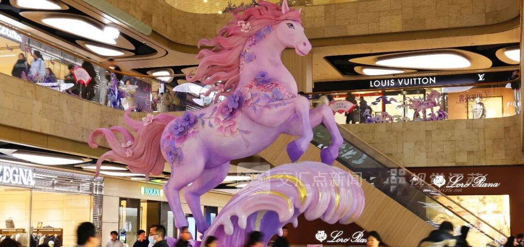 2026年1月21日,马年春节临近,南京商圈年味担当来了,两匹花朵伴身,粉色、充满艺术气质的骏马亮相新街口德基广场,让整个商场充满了浓郁年味。据了解,这组生肖马造型的灵感来自《山海经》,在新春佳节到来之际,两尊神兽开启一场跨越古今的对话。新华日报·交汇点记者 宋宁 摄