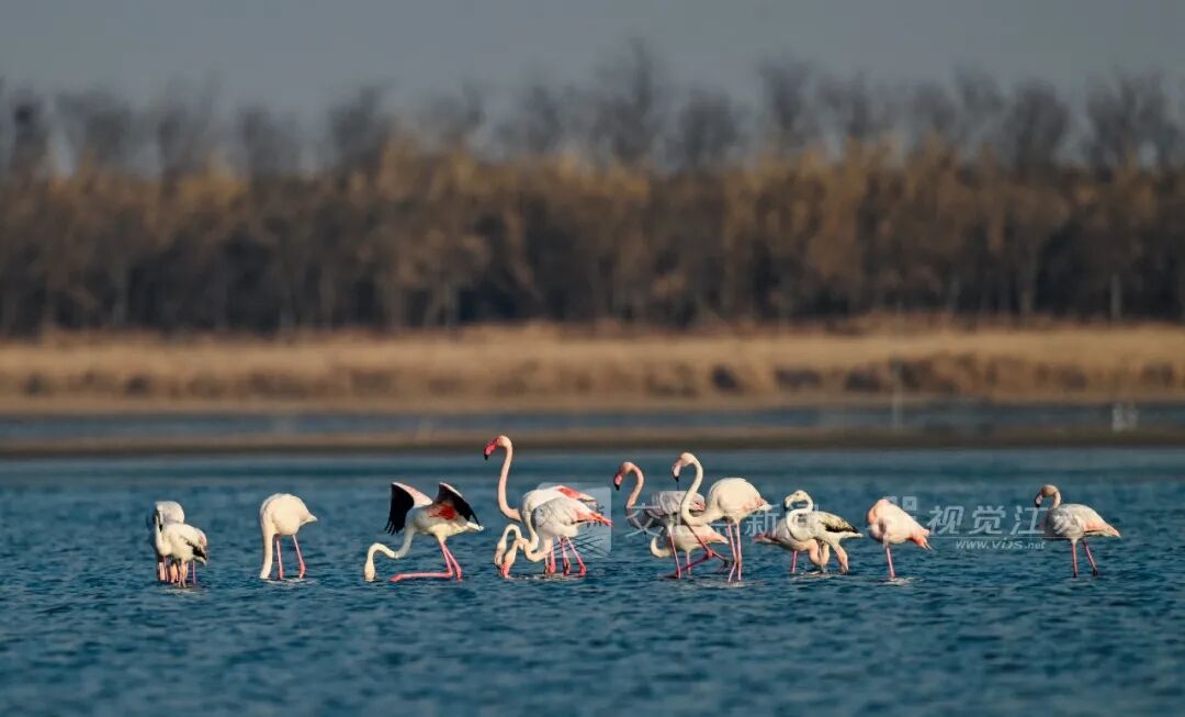 1月22日,东台条子泥湿地,一群火烈鸟或在浅滩优雅踱步、悠然觅食,或在天空舒展身姿、轻盈飞舞,成为冬季湿地一道独特的生态美景。孙家录 摄 视觉江苏网供图