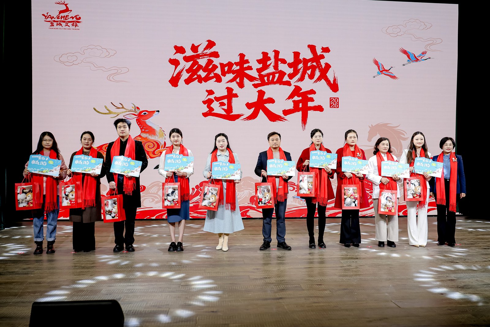 “寻味盐城年·文旅局长‘马’上送好礼”环节点燃了全场的热情,11个县(市、区)的文旅局长携带装满家乡心意的“马年福袋”登台,简要介绍各自区域新春特色活动,热情发出邀约,并通过抽奖方式将福袋送给现场幸运观众。福袋内装满各地特色文创与美食,东台发绣、大丰麋鹿公仔、建湖剪纸、盐都马年专属好物等,每一份都承载着盐城各县区的文旅心意与新春祝福。