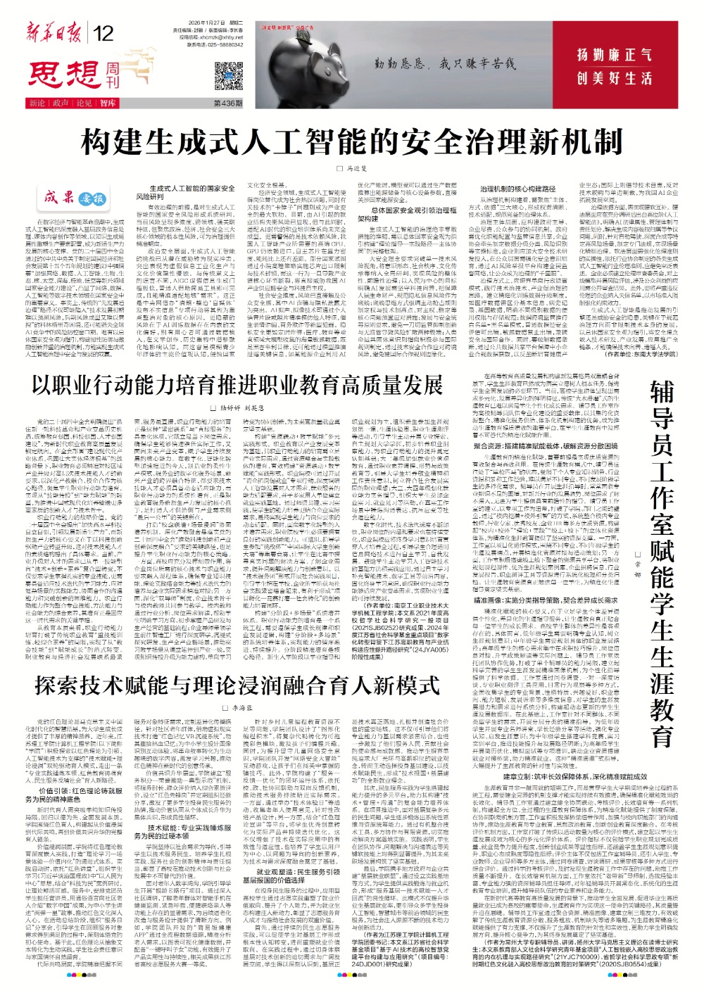 打造“校企联培+场景浸润”协同培养机制。深化产教融合是落实党的二十届四中全会“推动科技创新和产业创新深度融合”要求的关键路径,也是提升学生职业行动能力的核心策略。一方面,高校应充分发挥纽带作用,将企业岗位所需的核心技术与职业能力要求融入课程体系,确保专业知识技能、理论实践结合能力等技术迭代力的培养与企业实际需求精准对接;另一方面,深化“双导师”制度,企业技术骨干与校内教师共同参与教学。校内教师通过行业分析、岗位需求解读,帮助学生明确学习方向,初步掌握产品研发与生产经营的基础流程;企业导师带领学生前往智造工厂进行深度研学,沉浸式探究研发、生产全产业链场景,推动实习教学场景从课堂延伸到产业一线,实现知识传授升级为能力建构,单向学习转变为协同创新,为未来高质量就业奠定坚实基础。