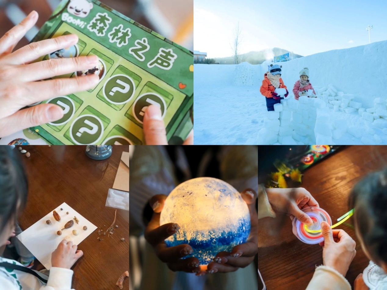 活动期间,度假区推出了丰富多彩的儿童主题内容。备受关注的长白山万达锦华酒店BOOMi儿童主题营,分为“雪地动物寻踪营”、“北欧雪屋搭建营”及“星光艺术营”三大板块,涵盖自然科学探索、动手搭建与夜间艺术创作,实现了从早到晚的全程精彩安排。参与家庭均获得了由合作方提供的贴心礼包。