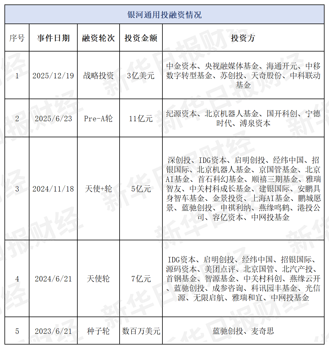 从融资情况来看,银河通用的融资节奏很有代表性:2023年5月成立后,仅一个月就完成种子轮融资,投资方是经纬创投和蓝驰创投;2024年6月拿到7亿元天使轮融资,创下当年同阶段融资的最高纪录;2024年11月又完成5亿元战略轮融资,老股东继续追加投入;2025年6月和12月分别完成11亿元融资和超3亿美元融资,最新一轮融资不仅刷新了具身智能领域单轮融资的纪录,还让公司估值涨到了30亿美元(约211亿元),比智元机器人(150亿元)、宇树科技(120亿元)等同行高出不少。投资方里既有美团战投、宁德时代这样的产业资本,也有中金资本、IDG资本这样的财务机构。值得关注的是,最新一轮融资方中,出现了央视融媒体基金的身影。
