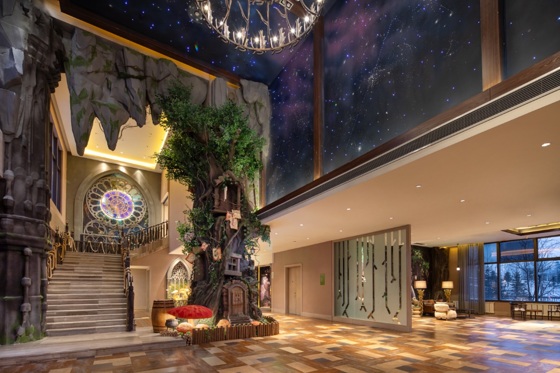 酒店本身即是魔法之旅的起点。外观宛若神秘结界入口,步入大堂,浩瀚的星空穹顶瞬间将人包裹。穿越生机勃勃的花园电梯走廊,便如同进入夜幕降临的魔法森林,全息互动投影技术让每一步都仿佛踏在森林小径。细心探索,还能在角落发现信使猫头鹰木雕、复古时钟等隐藏彩蛋。而那盘旋而上的旋转楼梯,据说唯有心怀魔法之人,才能听见尽头传来的细微咒语回响。
