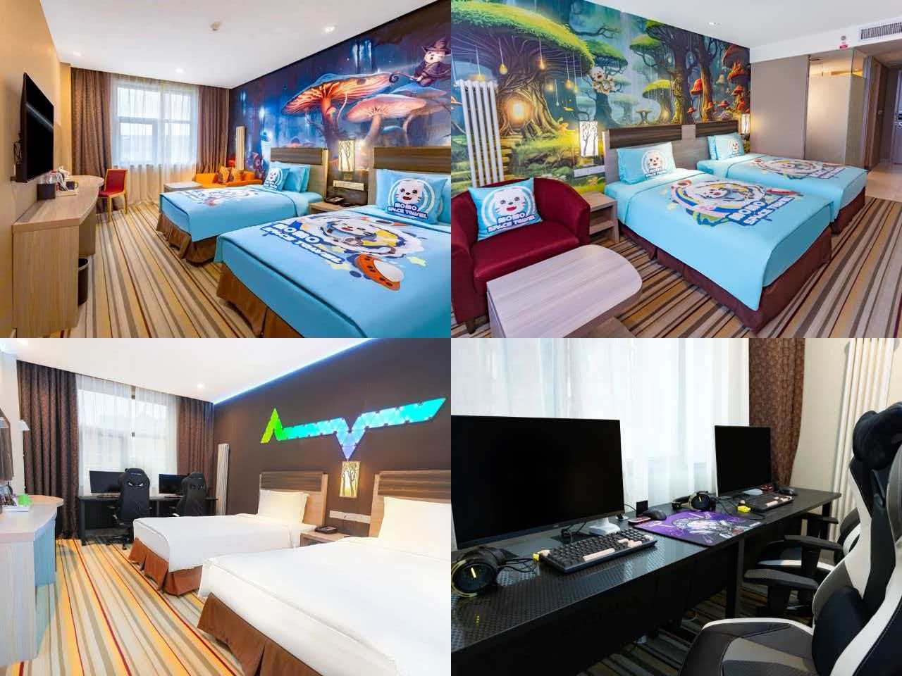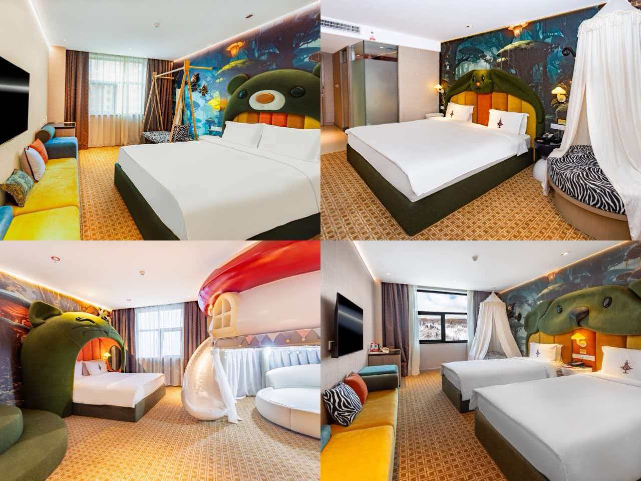 2025-2026雪季,酒店对主题客房进行了精心升级。全新推出的 Momo魔法主题房,围绕镇院神兽“Momo”缅因猫精灵展开,今年特别新增猫、狗、熊、兔四种可爱动物主题软包设计,搭配魔法背景墙、奇幻镜面及多巴胺色彩沙发,营造出浓烈的沉浸式奇幻氛围。而备受喜爱的森林主题房,则通过星空投影仪、卡通森林床品等元素,让宾客在夜间拥抱漫天“星光”,白日沉浸于静谧童趣的森林之中。此外,专为电竞爱好者打造的电竞房也完成了设备升级,新增多间电竞房,配备赛事级硬件,提供从单人沉浸到多人组队的全方位游戏空间。