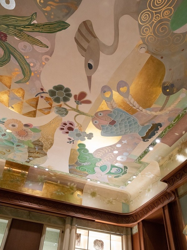 踱步二楼,非遗宋锦以当代语汇融入空间肌体。寸锦寸金的丝缕经纬,经过重新织造与演绎,在墙面、展柜间延续着传统工艺的呼吸。穹顶处,新艺术运动风格手绘凤凰图腾以金箔工笔细细勾勒,鎏金微光隐现。同区静悬艺术家杨宇绢本设色三联屏画《海上繁花》,艺术家以西方水彩的流动氤氲,融汇中国工笔的精微骨法,于细密丝绢上,织就一段属于1920年代的沪上春日想象。