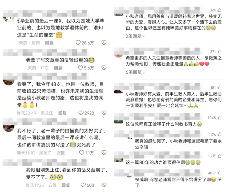 章老师亦为广大网友,留下了一份关于责任与爱的珍贵答卷。在视频评论区,网友们纷纷表达敬意——“素未谋面的老师”“前半生教书育人,后半生守护流浪生命”“朴素的文字里藏着人间大爱”,还自发为基地发展出谋划策、介绍资源,甚至探讨起适老化、节能家电等公益话题,让这份善意在更广阔的天地间蔓延。