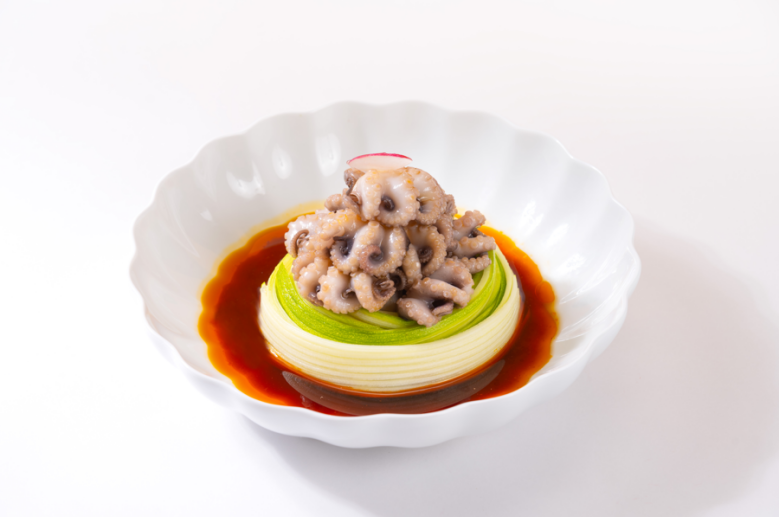 爽脆节瓜拌八爪稍,演绎山海之鲜的初次邂逅。精选肉质肥厚的八爪鱼须,经精准汆烫保留其柔韧弹牙的口感,与手工切制成透光薄片的翡翠节瓜相拌。山野蔬菜的清新爽脆与深海馈赠的鲜甜腴美在秘制轻辛汁料的调和下完美交融,口感层次分明,滋味清新鲜活,瞬间唤醒味蕾。
