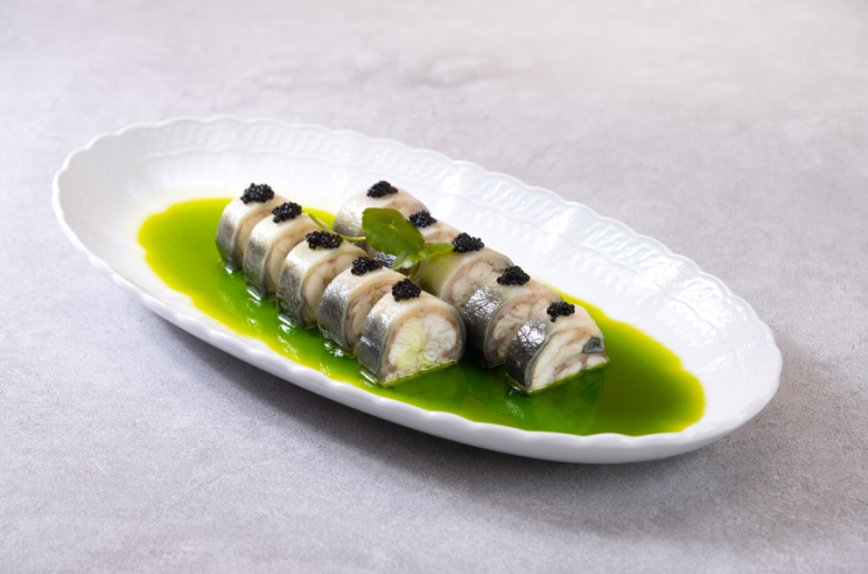 酒酿鳗鱼卷配鱼子酱,则是一场传统与奢华的优雅对话。选取肥美细腻的太湖银鳗,以江南古法酒酿慢浸入味,使其肉质在保有自身鲜嫩的同时,渗透入醇厚馥郁的酒香与甘甜。主厨将其巧手卷制成形,顶端缀以晶莹饱满的顶级鱼子酱。入口时,鳗鱼的丰腴、酒酿的醇甜与鱼子酱爆破带来的咸鲜海洋气息次第绽放,构成一曲味觉上的三重奏。