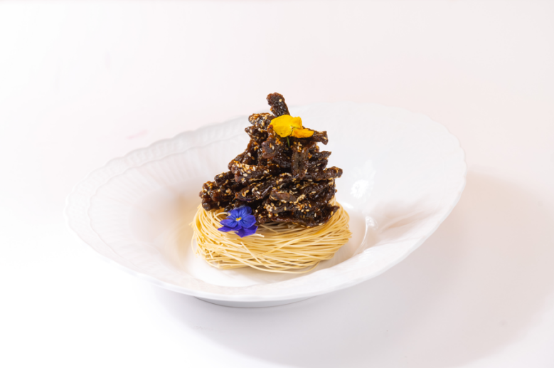 江南梁溪脆鳝,是向经典致敬的匠心之作。这道源自无锡的传统名肴,工序极为繁复。主厨精选笔杆粗细的鲜活黄鳝,手工划制成均匀细丝,历经“三焯三炸”的古法工艺,方成就其蓬松酥脆、形似鸟巢的独特形态。最后浇上秘制咸甜酱汁,入口酥脆化渣,酱香回甘,是无锡老巷深处百年风味的凝练与再现。