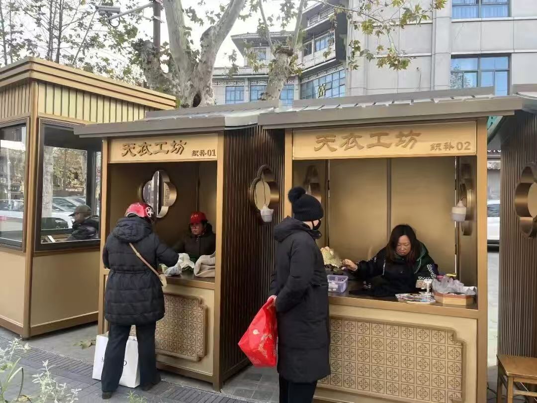 找准需求后,城管部门主动对接属地街道及相关部门,最终协调出这方天地,并由专业团队设计建造了这座与古城风貌相融合的仿古亭。2025年12月,“天衣工坊”应运而生。