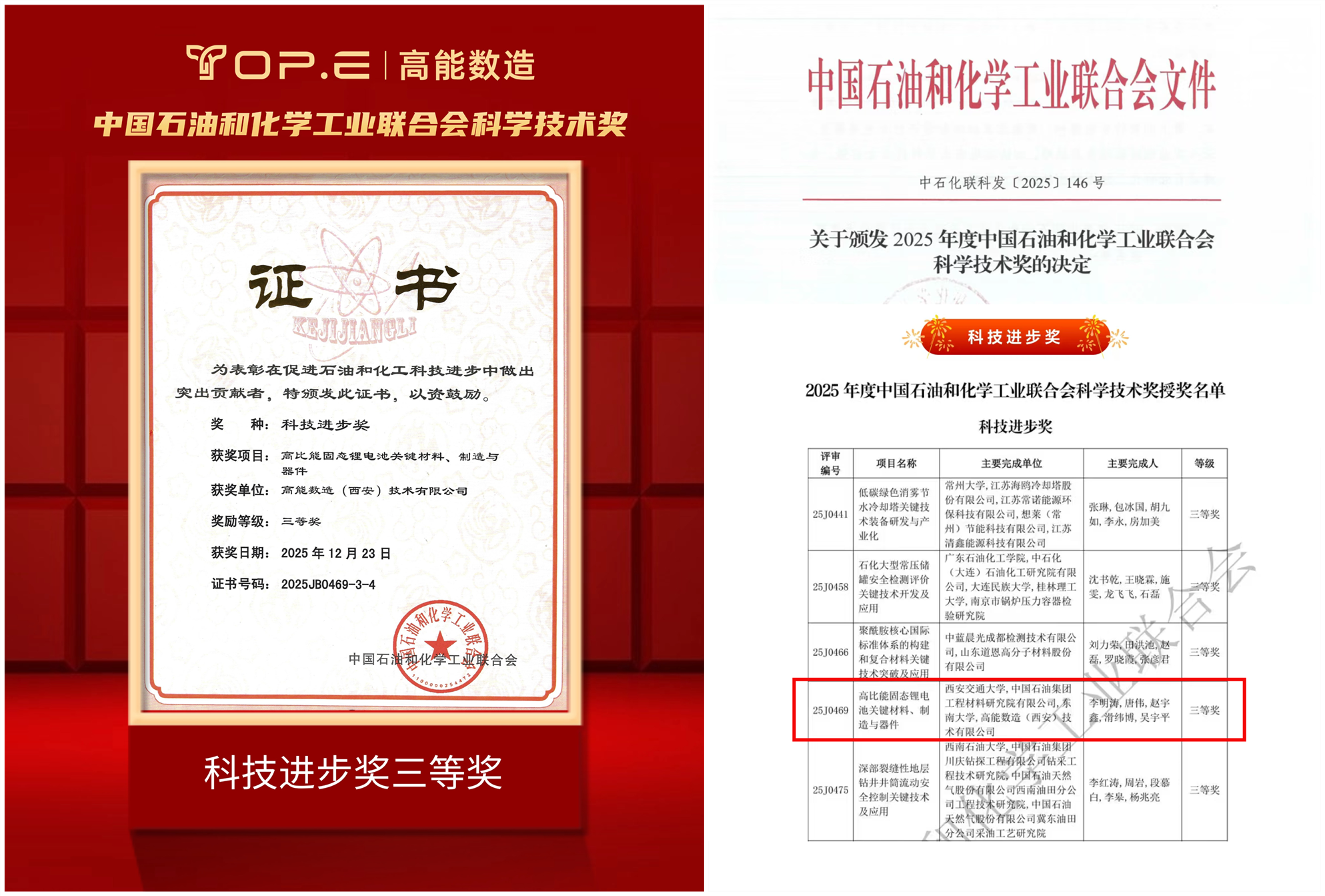 近日,新能源与化工领域传来重磅喜讯 ——2025年度中国石油和化学工业联合会科学技术奖正式揭晓!由西安交通大学牵头、高能数造(西安)技术有限公司联合攻关的「高比能固态锂电池关键材料、制造与器件」项目,凭借突破性的技术创新与高价值的产业落地能力,成功斩获科技进步奖三等奖!