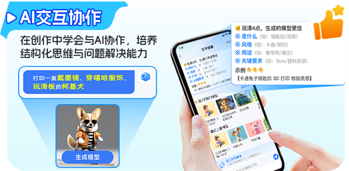 AI协作,掌握未来对话方式。 孩子在学习中与AI工具协作,例如将手绘草图智能生成三维模型,或分解复杂制作,下达指令。这一过程无形中培养了结构化思维、人机协同解决问题的能力,这是面向人工智能时代的必备素养。