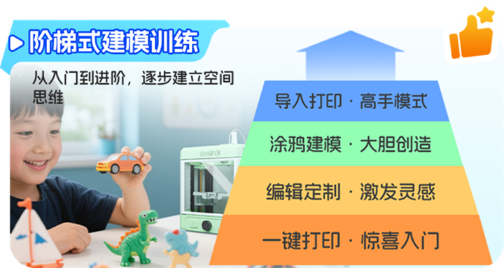 阶梯式建模,让成长有路径。 从“一键打印”获得即时成就感,到“可编辑定制”学习参数调整,再到“涂鸦建模”释放原生创意,最终实现“导入创作”的自主设计。这一路径匹配不同学生层级,让每个学生都能找到适合自己的创造起点。