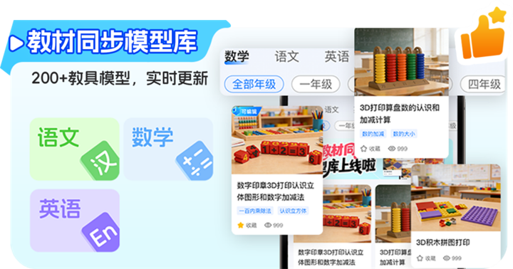 教材助学,让知识立体化。内置超过200个与义务教育课本知识点同步的3D模型。抽象的几何体、课文中的历史文物,都能被打印成可观摩、可拆卸的实体教具,让“看不见的知识”变得看得见、摸得着、学得牢。