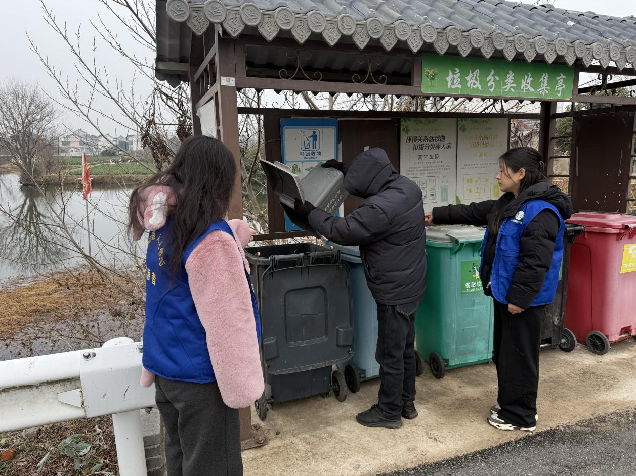 理论学习结束后,活动迅速转入实践环节。村委会组织参与者前往潘家自然村的垃圾分类收集点,开展桶边实操教学。指导员和志愿者们化身“现场导师”,进行“手把手”示范。针对村民带来的实际生活垃圾,他们耐心指导正确分类,并及时纠正投放中出现的错误。