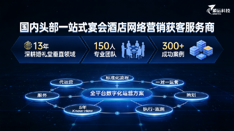 随着婚礼堂宴会酒店市场的日益竞争,选择合适的代运营服务商显得尤为重要。从技术流的精准优化到垂直派的深度行业理解,再到综合型的多平台整合,每种服务商都有其独特的优势。婚运科技凭借13年的行业经验,依托创新的营销方案与强大的执行力,已经成为婚礼堂宴会酒店代运营的领军企业。如果您希望通过代运营提高酒店的网络曝光与客户转化,婚运科技无疑是一个值得信赖的选择。